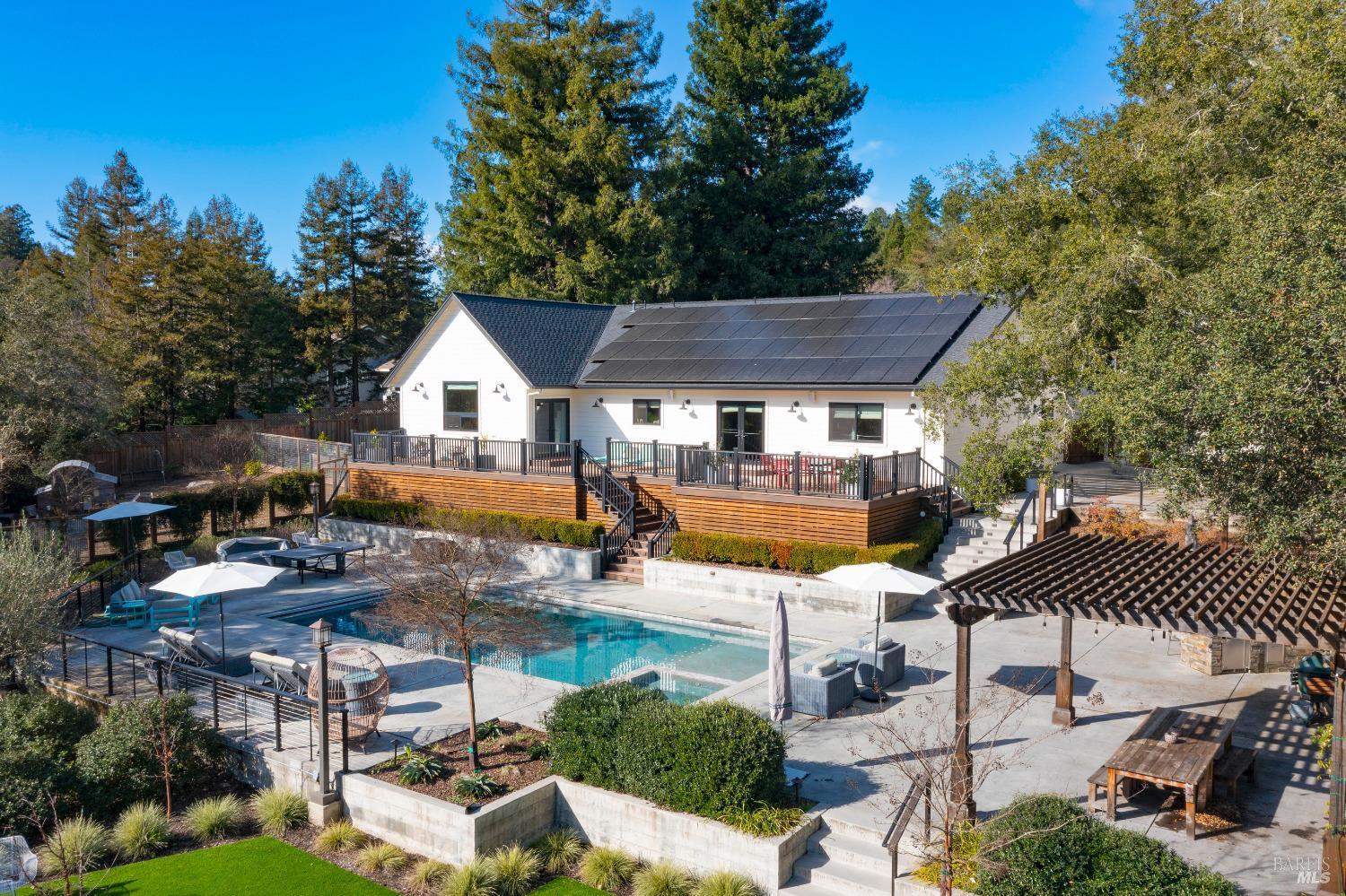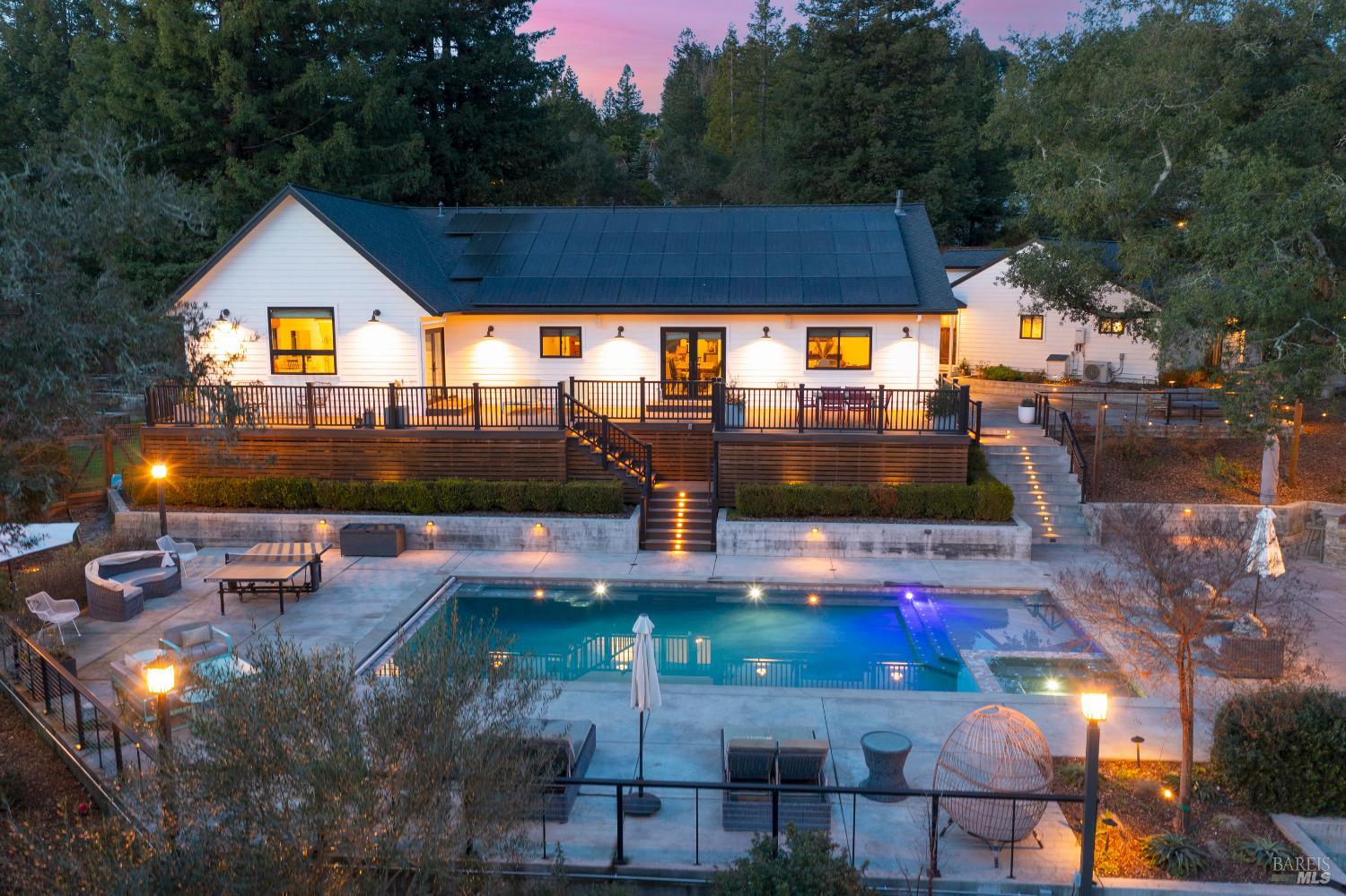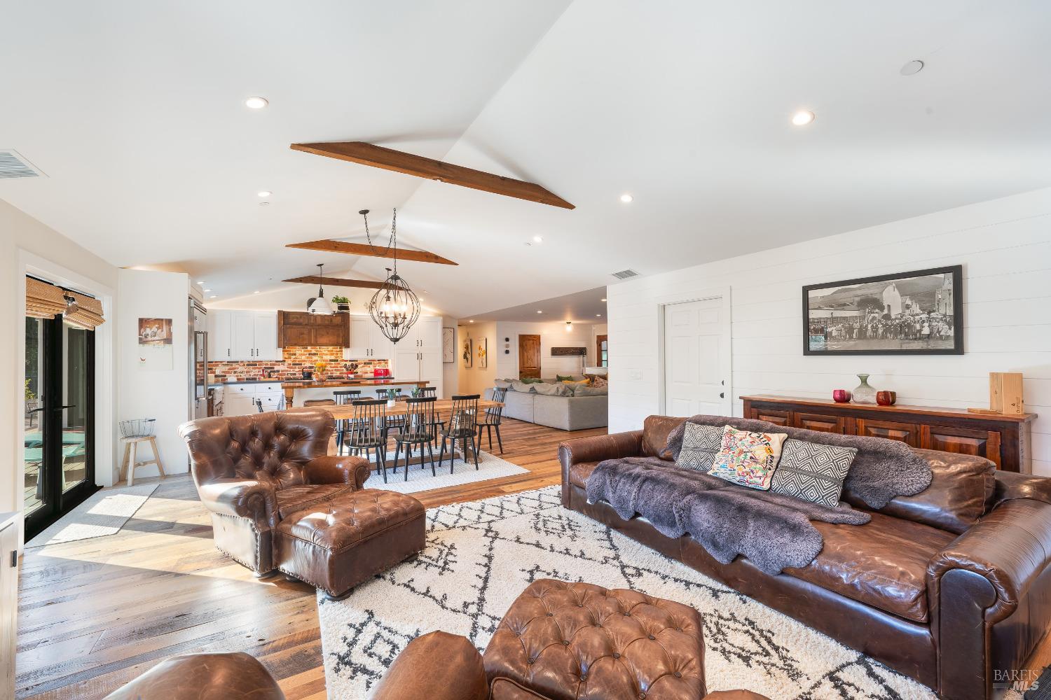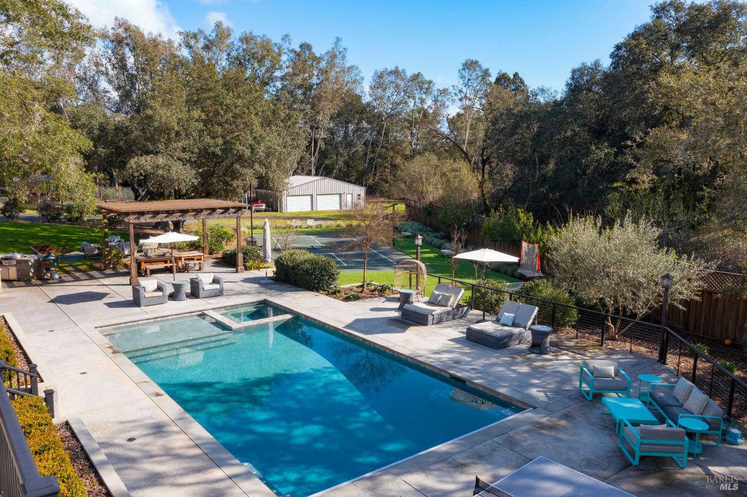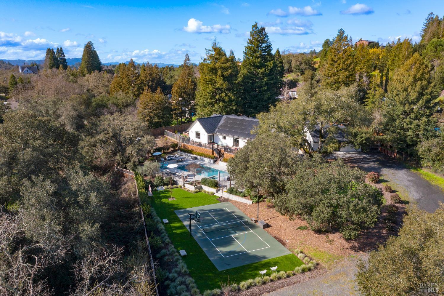 Nestled at the end of a cul-de-sac, this 1.5 +/- acres lot boasts a 3 bed/2 bath single-level farmhouse, a 1 bed/1 bath guesthouse, and a plethora of superb amenities. A comprehensive renovation in 2018 brought this once dated home up to a modern day aesthetic. The open floorplan is bathed in natural light and showcases designer accents and reclaimed barn wood floors throughout. The gourmet kitchen is a culinary enthusiast's dream, complete with Viking stainless steel appliances, quartz countertops, and a spacious center island. The backyard is the epitome of a private oasis, perfect for family gatherings. It features everything you could ever want to entertain; a pool, a hot tub, an outdoor kitchen, a cozy gas firepit, built-in surround sound, pickleball, a chicken coop, a kid's playhouse, garden beds, and a sports court. In addition to the impressive 2,400 sq ft main residence and the detached 800 sq ft guest cottage, there is generous 1,200-sq ft shop with attached covered RV parking. Ideally situated just minutes away from the Healdsburg Plaza, world-renowned wineries, fine dining establishments, and boutique shopping, this property offers the ultimate wine country living experience.