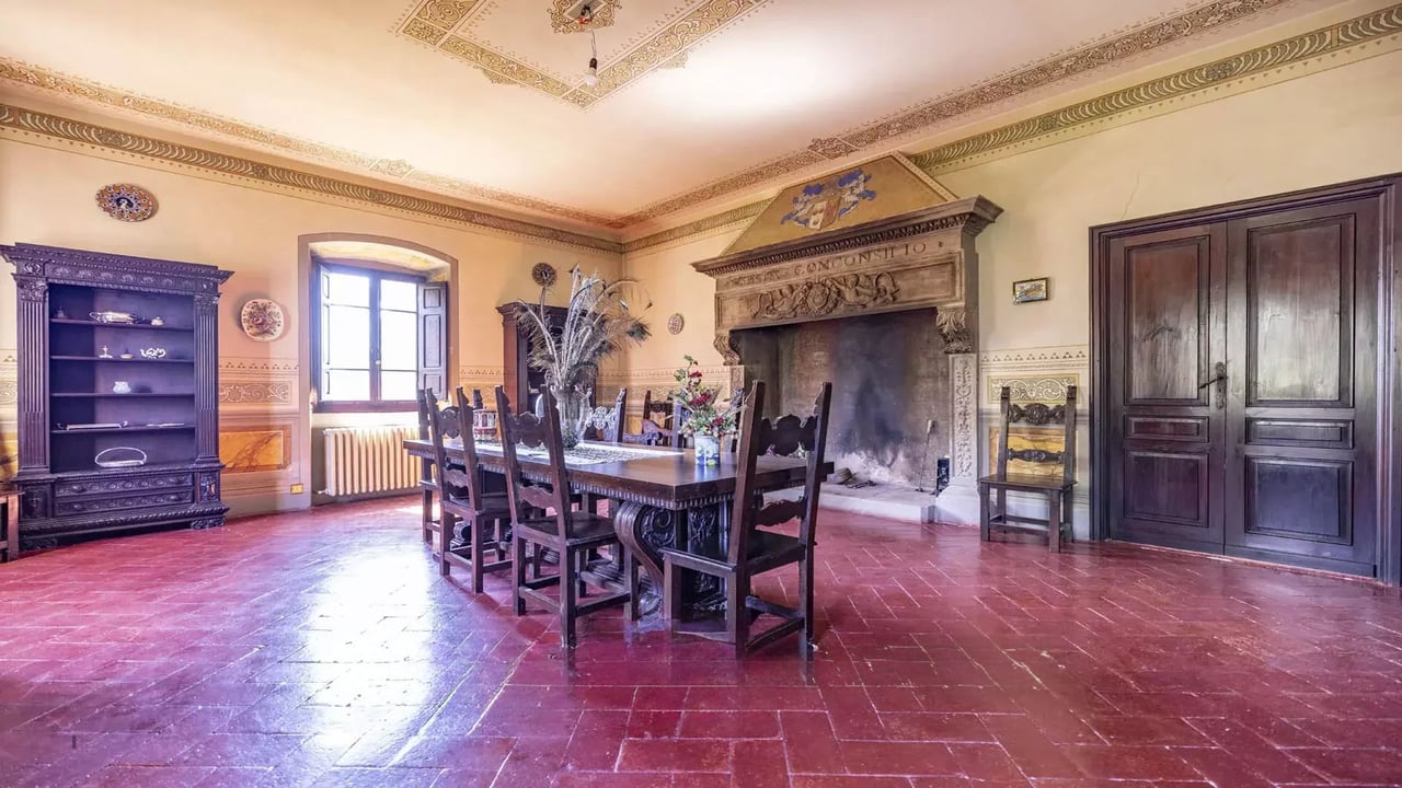 The villa is further enriched by two historically significant elements: a Madonna attributed to Jacopo della Quercia and a fireplace attributed to Michelangelo Buonarroti.
